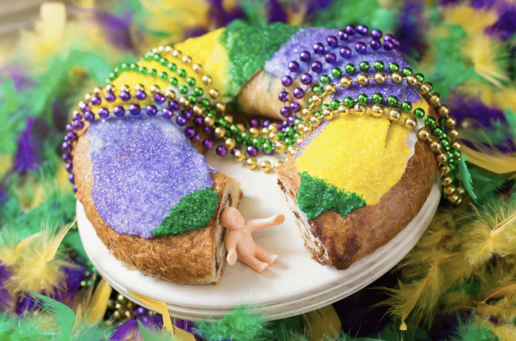 - Nueva Orleans (King Cake): Un rol con sabor a café en forma de rosca, glaseado en amarillo, verde y morado (colores del Mardi Gras). Se rellena de queso crema y frutas; quien encuentra el muñeco debe comprar el siguiente postre u organizar la próxima fiesta.